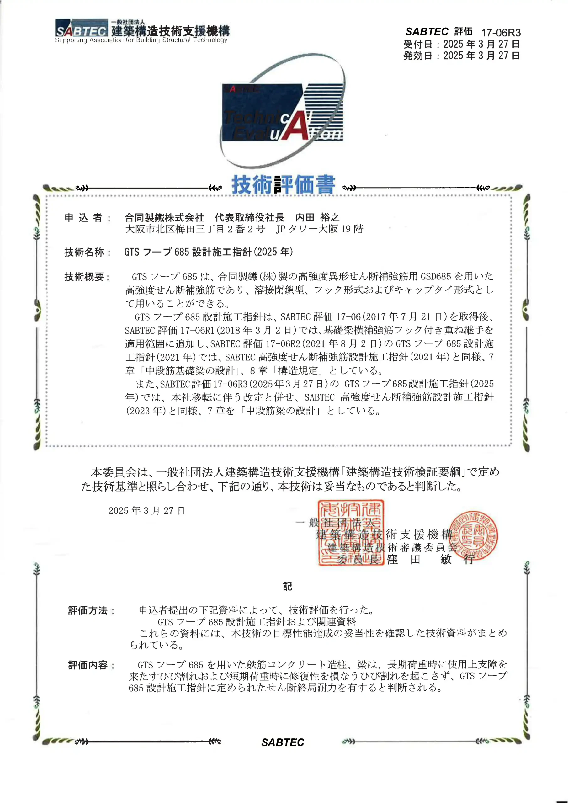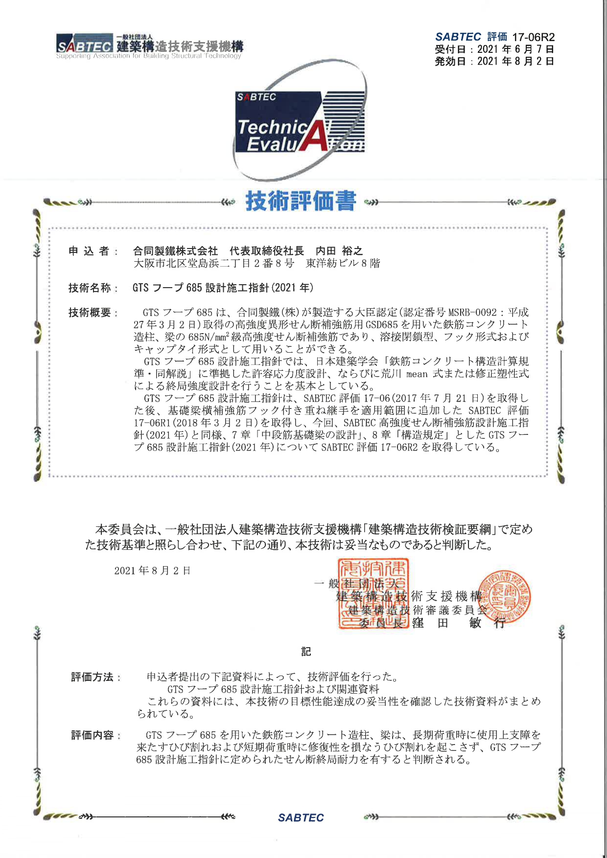 大臣認定 国住指 第3305-1号 MSRB-0092 工法一般評定 SABTEC評価 17-06R3 -