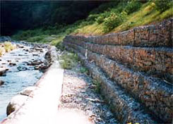"菱形金網で加工され、かごに小石を詰めてかご全体に重量、強度をもたせかごの持つ可塑性、表面強度などの特性を生かし使用されています。
